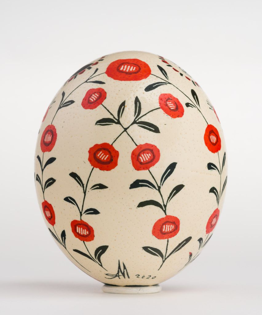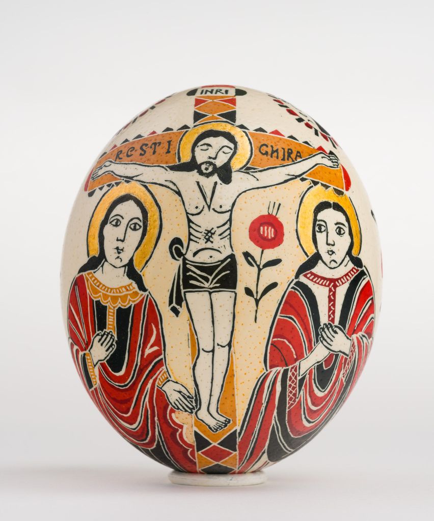 Inspirația a venit din picturile pe sticlă din Transilvania secolelor XVIII-XIX. Aceste motive au fost transpuse pe suprafața curbată al oului de struț, respectând în totalitate particularitățile stilistice specifice școlilor de pictură pe sticlă.