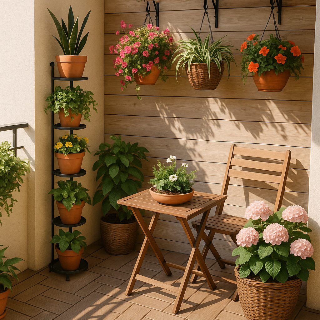 Pentru a crea o oază verde pe un balcon sau o terasă mică, se poate folosi eficient spațiul pe verticală prin decorațiuni montate pe perete sau suporturi de flori verticale. Însă, suporturile de flori tip turn se pot folosi în anotimpul rece și în apartament. Se mai pot alege flori în suporți tip agățătoare, care așezate inteligent, pot umbri zona de relaxare.