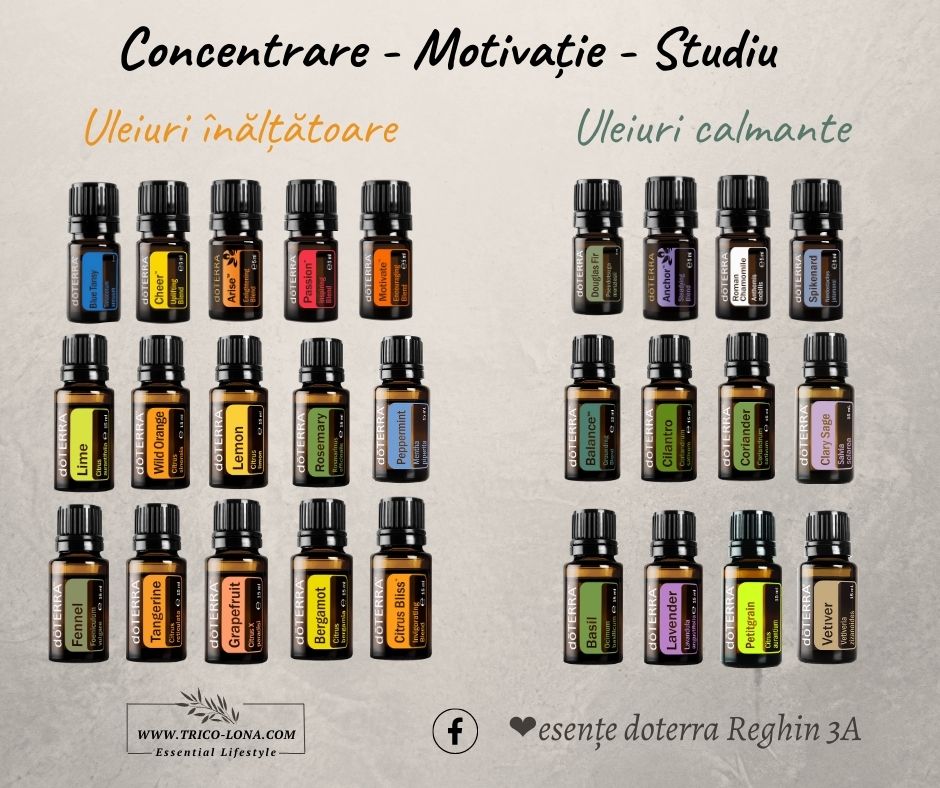 Cum uleiurile esențiale cu proprietăți chimice calmante și înălțătoare pot fi folosite pentru a crea un mediu care este propice concentrării, există multe uleiuri esențiale cu proprietăți înălțătoare, energizante și revigorante care vor contribuie la promovarea unui mediu motivant.