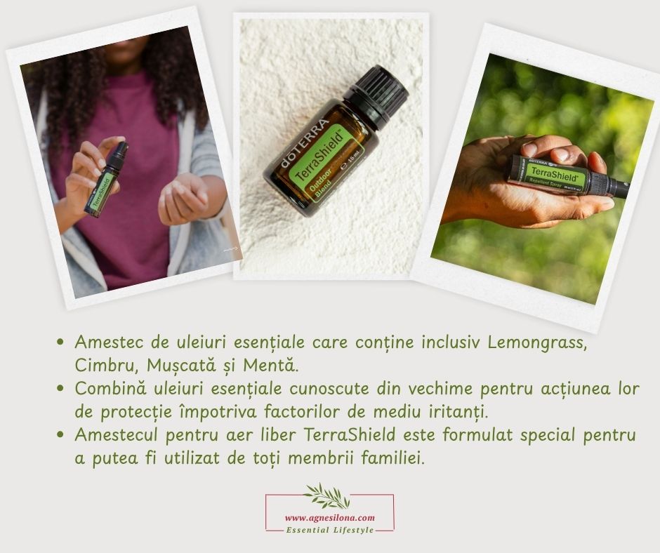 Țânțarii și alte insecte pot transforma rapid o seară liniștită într-un moment de disconfort. TerraShield este un spray 100% natural, cu un miros proaspăt, citric și ușor lemnos, datorat amestecului de Lemongrass, Cedarwood, Peppermint și alte uleiuri esențiale recunoscute pentru proprietățile lor repelente.